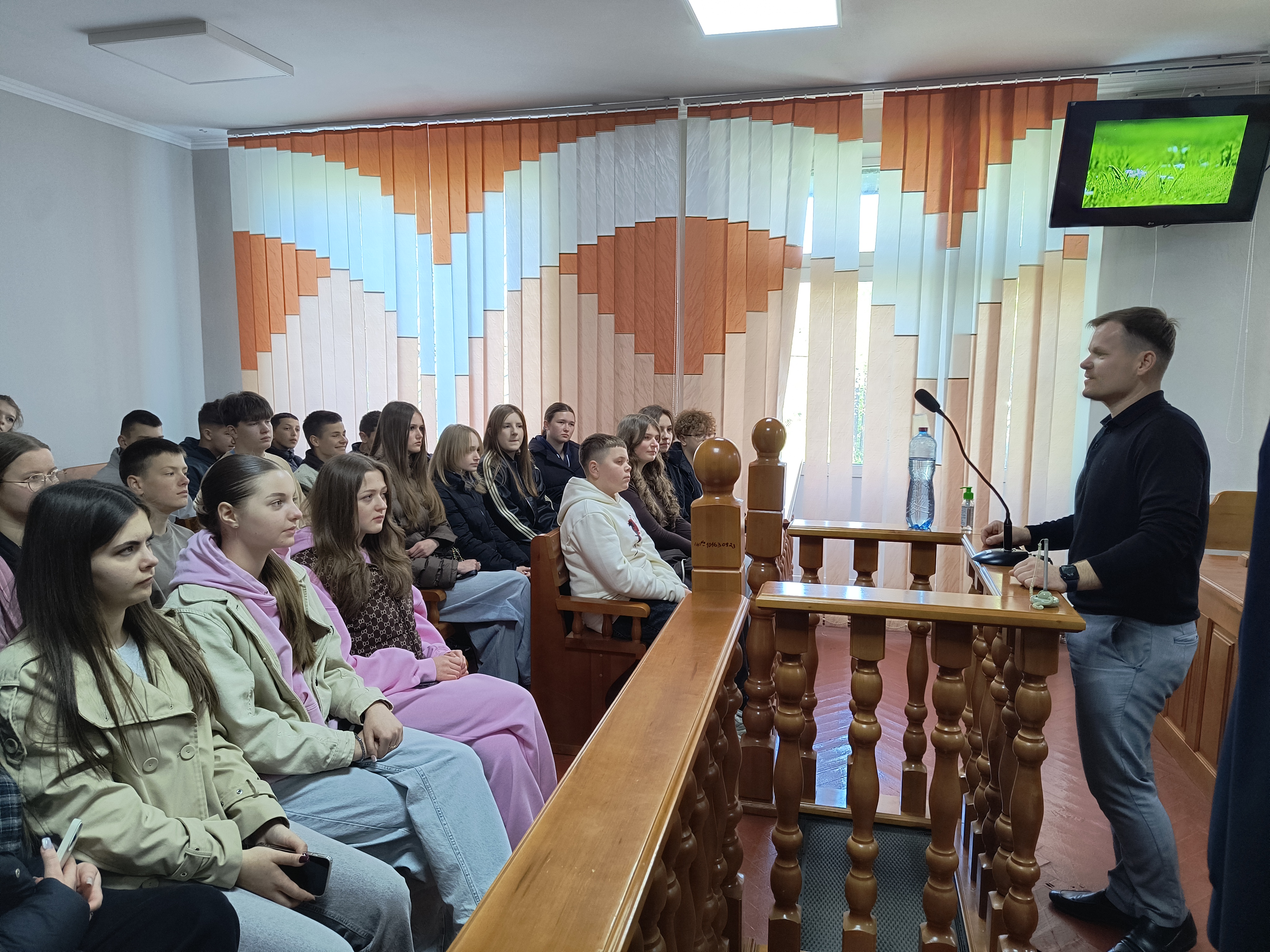 Також у доступній для дітей формі було роз’яснено порядок надання та отримання інформації, порядок звернення до суду, про що слід пам`ятати під час перебування в суді, як поводити себе під час слухання справи, які існують негативні наслідки порушення правил поведінки в суді. Учням було продемонстровано зал судових засідань, там вони змогли відчути себе суддями, зайнявши почесні місця, сторонами процесу, секретарями та вільними слухачами.